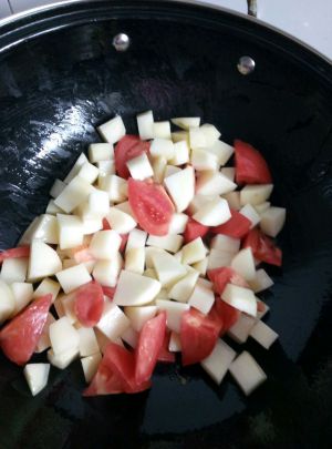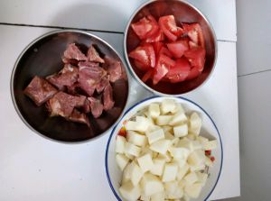 我用的是袋装可以直接吃的熟牛肉一袋,切小块,土豆番茄切块。