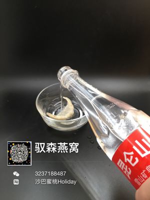 将燕窝放入干净的玻璃碗中,倒入昆仑山矿泉水泡发,水量达到燕窝4倍以上。