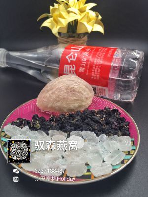 准备食材:昆仑山矿泉水一瓶、驭森燕窝一盏、黑枸杞5-10粒、冰糖适量。