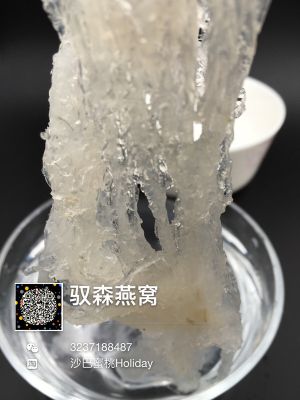把燕窝撕成一条条,图片这个是燕角的地方,因为金丝燕筑巢在墙,需要固定,燕角特别重要所以要厚实,一般燕角泡发需要8个小时。很多人以为是刷胶,其实不是的。但不排除有刷胶的燕窝哦!!!