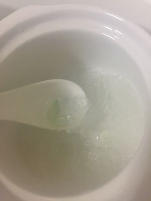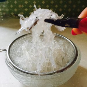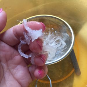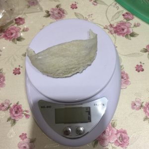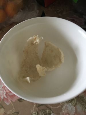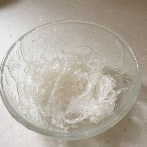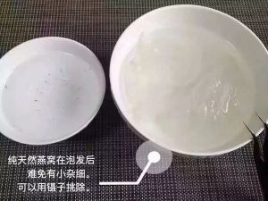 这是泡了5个小时的燕窝,这个时候可以挑一下细毛。挑毛的时候尽量按纹理撕燕窝。