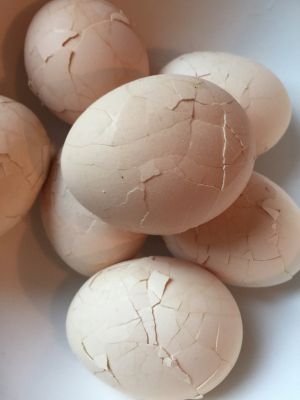 捞出,过凉水,待不烫手时讲鸡蛋敲碎