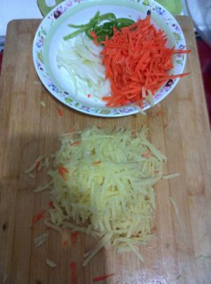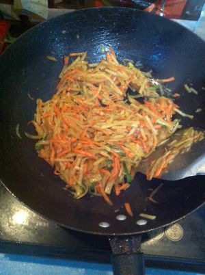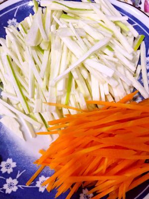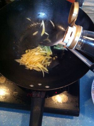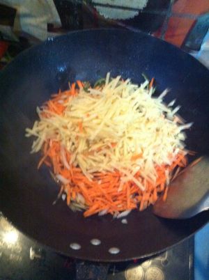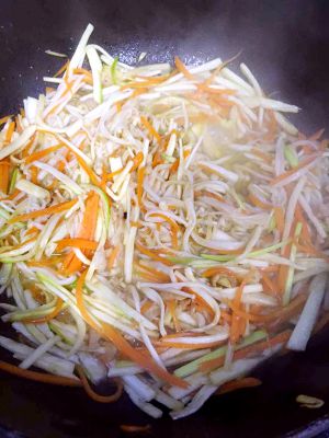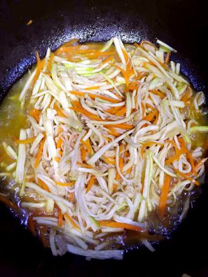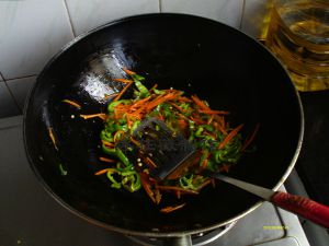 起油锅,先滑入胡萝卜丝、青椒丝翻炒变软。