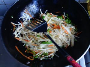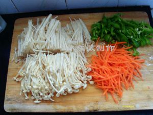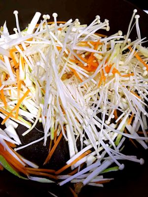 加入茭白丝、胡萝卜丝、金针菇翻炒。