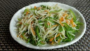 锅里倒入油,放入葱姜丝爆香后倒入切好的三丝炒。忘记拍照片了,三丝倒入之后加入盐和醋。最后加入鸡精调味即可。