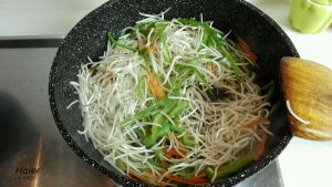 尖椒洗干净去籽切成丝,胡萝卜去皮洗干净切丝,自发绿豆芽去头去尾冲洗干净沥干水分,全部备用。