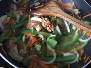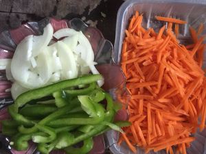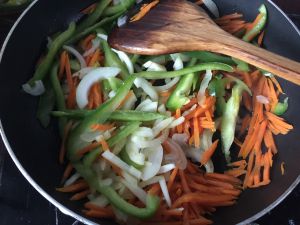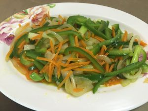 锅里热油后先加胡萝卜翻炒再加洋葱和青椒翻炒,加少许盐