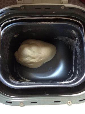面粉、鸡蛋、发酵粉、盐、油、水,这些相应重量的材料全部放入面包机和面团