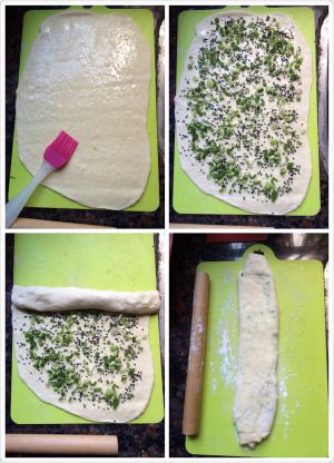 面团分两份,取一份擀成薄薄的刷一层油,再撒上葱花和芝麻,卷起再擀开,再刷一层油再撒一层葱花和芝麻(按这步骤连续三次)