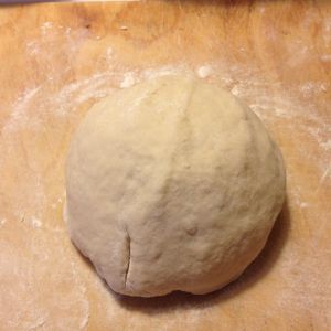 面粉放大盆加开水半碗后加猪油2匙加冷水一碗揉成三光!