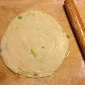 将其分四个剂子,每个用面杖擀圆,均匀撒上葱花和适量盐,从上往下卷,再从左往右卷,用手按好后,再用面杖擀圆。