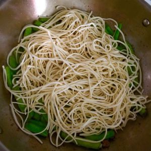 焖烧三分钟左右后,打开锅盖品尝一下面条,如果还有生的味道就继续焖一分钟,此时要观察锅底还有没有水,锅底干了再加少许热水。如果面条熟了就把拍好的蒜瓣放入锅中,然后把扁豆和面条一起再翻炒一小会儿,看面条吸收了汤汁即可关火。