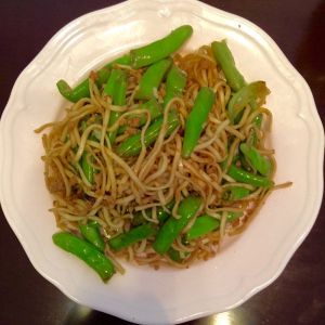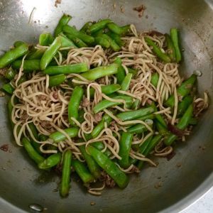 面条挑松放在扁豆上。盖盖焖十分钟。再把面条挑松翻面,加入半碗汤汁,焖至面条熟。关火,把炒好的鸡蛋放进锅里翻炒,再把蒜蓉、醋、香油加入翻炒均匀。实在太好吃了!
