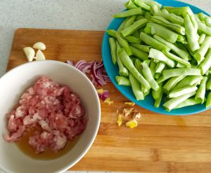 把扁豆洗净,土豆切块,五花肉用蚝油香油,料酒,生抽老抽,生粉腌制15分钟