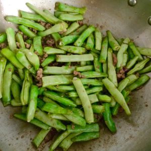 材料备齐,扁豆剥去边筋掰成寸段,肉末里加少许料酒腌制一会,锅烧热后放入适量油,加入适量花椒大料煸出香味,大蒜拍碎待用。