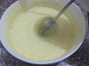 慢慢倒入蛋黄糊中,边倒边搅拌。
