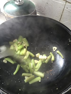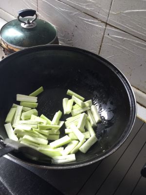 锅里再放1勺油,油温热后倒入丝瓜加盐加少许生抽翻炒