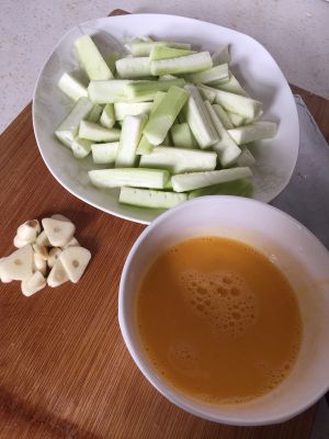 锅刷干净再次倒油,开中大火,油热后放入姜片爆香,然后把丝瓜和蒜蓉一起放入翻炒。如果锅里太干可以稍微加点水,少量多次加,千万不要加多。加入酱油和食盐,待丝瓜完全变软之后放入鸡蛋,炒匀出锅即可