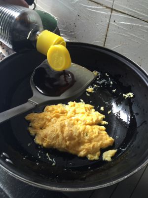 下猪油热锅翻炒鸡蛋,加入适量生抽翻炒出锅,保证嫩滑口感
