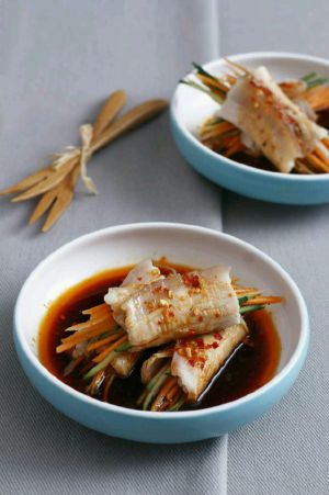 用煮好的肉片包裹黄瓜丝、胡萝卜丝和葱段做成卷摆盘。生抽、辣椒油、蒜泥、白糖和香油调成汁。