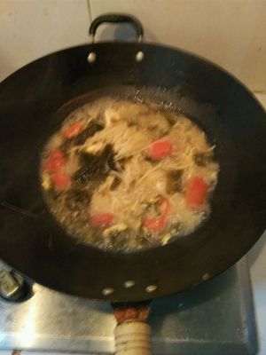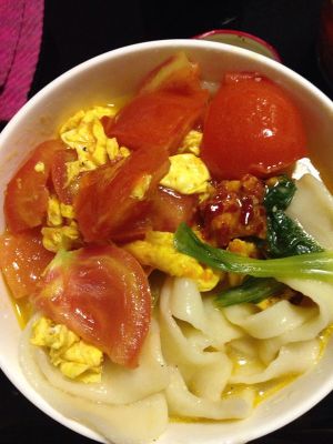 最后把炒好你蕃茄炒蛋加进去再来块豆腐乳或辣椒酱,醋什么的棒棒哒