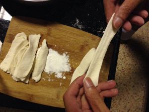 和好之后用刀切成这种小条,然后拉长,锅里可以边烧水