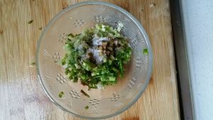 锅中放油,油热把葱花略微炒一下,加入盐和五香粉盛出备用。