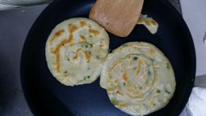 面团做成长条饼,涂上葱油,卷成条,卷成圈,再擀成饼,放在煎锅上。我没有电饼铛,只好用煎锅