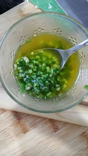 自认为用橄榄油会健康点,油热了直接倒在碗里,搅拌一下,厨房里顿时香葱的味道