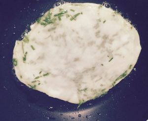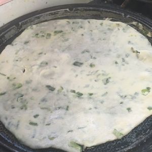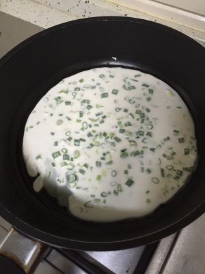 热锅加少许油,然后淋入一勺半的分量(视自己的不粘锅和勺子大小来定)