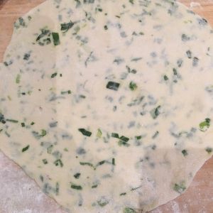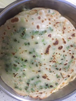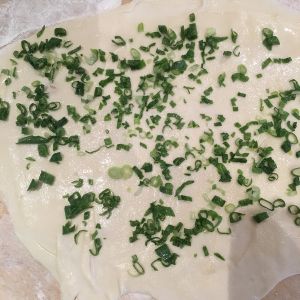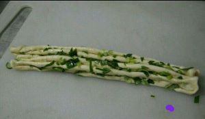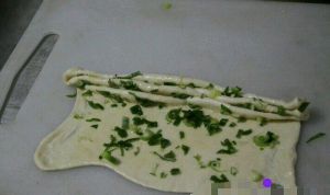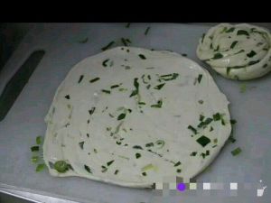擀成薄皮抹上一成油,撒上葱花盐,卷起