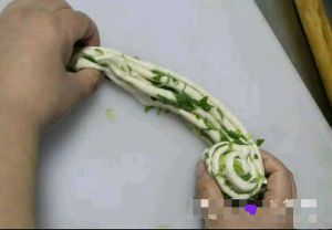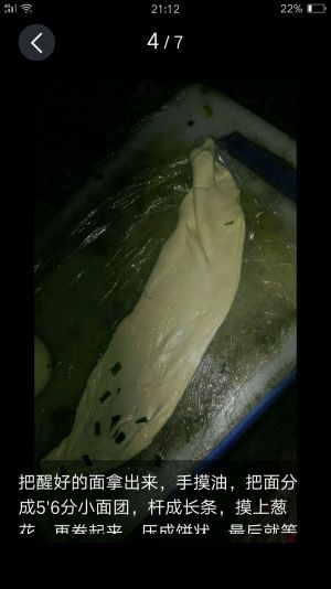 把醒好的面拿出来,手摸油,把面分成5'6分小面团,杆成长条,