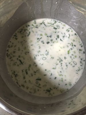 把面粉、水、盐、鸡粉混合搅拌均匀至无颗粒状,然后加入葱末、少许油搅拌均匀即可。
