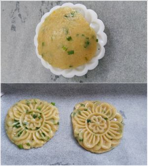 8.把面团放到划片上慢慢压扁,我用的100克月饼的花片,直径大概是7cm,厚度在0.3cm,不建议做太厚,虽然好脱模,但是烤的时间相对来说比较久,太薄了也不容易脱模.