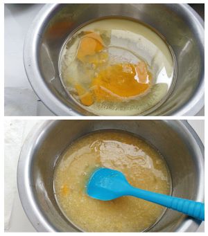 3.把玉米油,白糖,鸡蛋,盐放进大碗里搅拌均匀