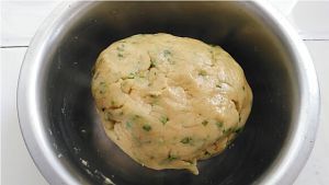 往面粉中直接加入开水、烫面,与此同时边加开水边用筷子搅拌。一定要搅拌均匀,烫面的均匀是葱油饼外酥里嫩的关键。等到面不太热的时候,将其揉成表面光滑的面团。然后用保鲜膜将其封住,再静置半个小时。