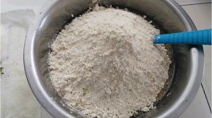 面粉倒入容器里,留一点擀面饼时扑到面板上