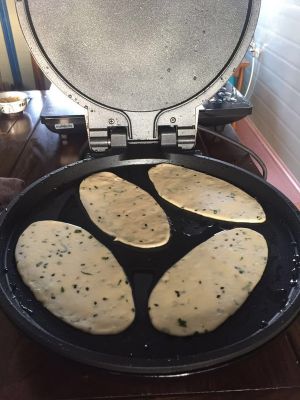 醒好的面团反复揉搓之后分成若干个小剂子,用擀面杖将小剂子擀长,涮上油酥,加上葱之后卷起来搓圆在擀长(此处不好拍照,所以没有拍照),将电饼铛涮油预热,将做好的饼放入,涮油,合上,等待成熟!