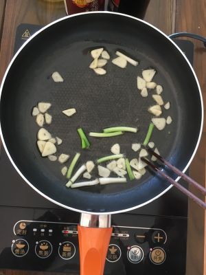 锅中加入适量的油,将葱的前段和蒜放入热油中煸炒出香味,将葱蒜末挑出!