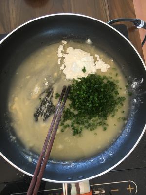 热油中放入适量的面粉做成油酥,等油酥冷了之后放入葱搅拌均匀!(PS:油酥中可以不放葱,等做饼的时候涮层油酥在放葱也可以,我比较爱偷懒)
