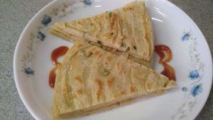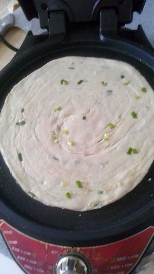 锅里放比烤其他煎饼时要多些的油,这样烤出的葱油饼才不会干硬并且外脆里软,葱香味更浓厚。