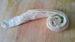 将醒好的面擀成长方形,先在表面均匀的涂上刚才炸好的油,再均匀的撒上葱花,从长的一边开始卷,卷好后切段,揉成一个个的面团