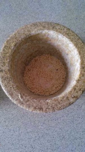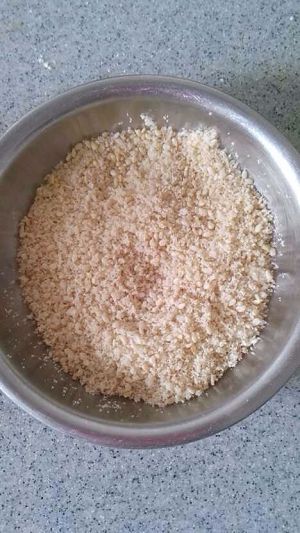 适量芝麻加点盐,用料理机打一下不要太碎了,或用擀面杖擀,一点芝麻用料理机嫌麻烦,我直接就用捣蒜的盅捣了