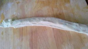 (忘记照卷饼子的图片了)从底部开始往上把面皮卷起来,然后边轻拉边收紧的卷成图中这样,最后将尾部塞进面团的中心里去,把面团按一下,盖保鲜膜醒10分钟以上。