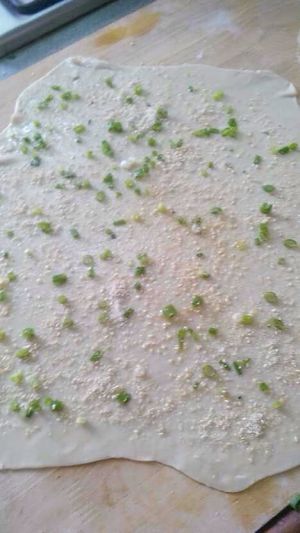 醒好的面团分成小份份,擀成薄面片,越薄越好,刷一层油,撒些葱花,再撒上芝麻盐