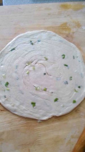 挖适量的葱油苏在面皮上用勺子的底部匀开。