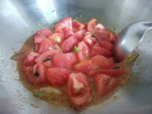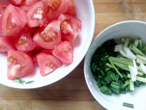 锅里放油,加入小葱爆香,加入西红柿小火炒出汤汁