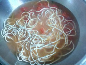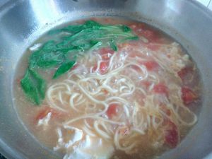 把150克的面条加入番茄浓汤中,(水不够可以适量加一点)面条8成熟后加盐、加入炒好的鸡蛋,起锅装盘!