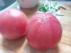 先处理西红柿,用滚水烫一下,去掉表皮,这个步骤很重要,不然会影响口感。
