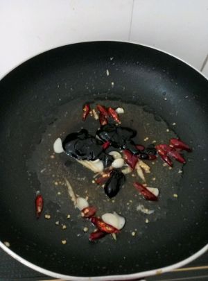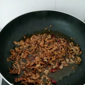 加入半熟肉丝,放入料酒,食盐,鸡精。之后小火勾芡。